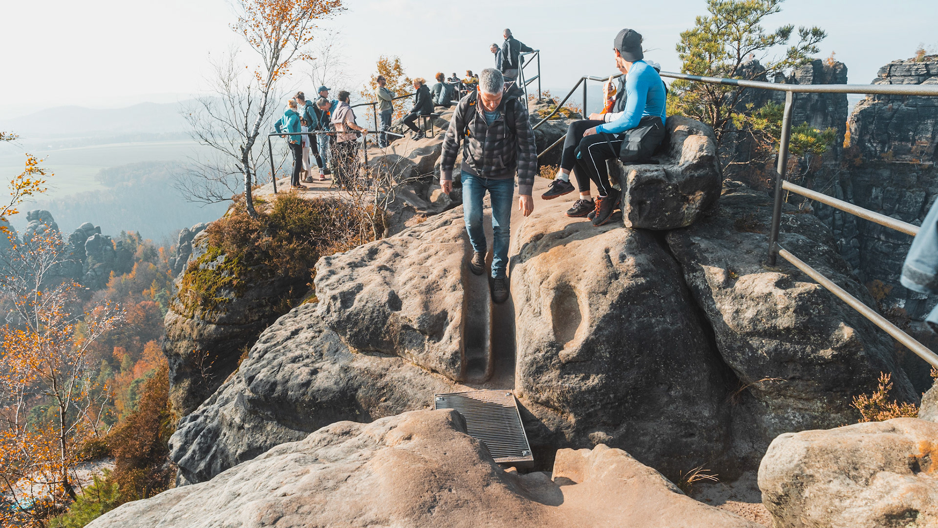 After about 4 km the adventure begins: climbing ladders to Schrammsteinaussicht. This viewpoint is a must, it opens up to dramatic rock formations. Be careful, though, the steps are narrow and steep, crowded with people, and not always protected by handrails.